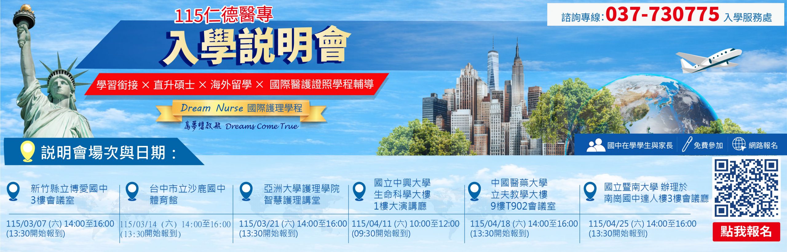 115學年度入學説明會完全免試入學 橫幅入學説明暨科系體驗活動橫幅 仁德娃115年離島地區報送甄選JPG-1115學年度核定招生名額分配表-1113-03113-051113-04113-016第四届動物醫事助理單科班招生 橫幅-011-023-021員榮網頁-041-02 仁德醫專新生獎學金五專招生日程認識仁德醫專填寫新生意願調查表115學年度花東離島及原住民獎助學金方案2026 年 2 月 24 日115學年度偏遠地區住宿補助方案2026 年 2 月 24 日【仁德醫專新生獎學金】2025 年 2 月 24 日115學年度五專完全免試入學時程表2025 年 1 月 15 日115 學年度澎湖離島地區國中應屆畢業生升學五專保送甄選2024 年 11 月 27 日more校園平面圖交通路線最新更新日期:114/2/25 網站維護人員:謝昀凌